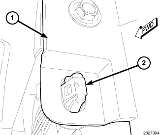 8. Pull the gap hider bezel up and away from the instrument panel far enough to access and engage the retainer clip (2) of the service length of the instrument panel wire harness SCCM take out to the instrument panel base trim (1) on the right side of the steering column opening.