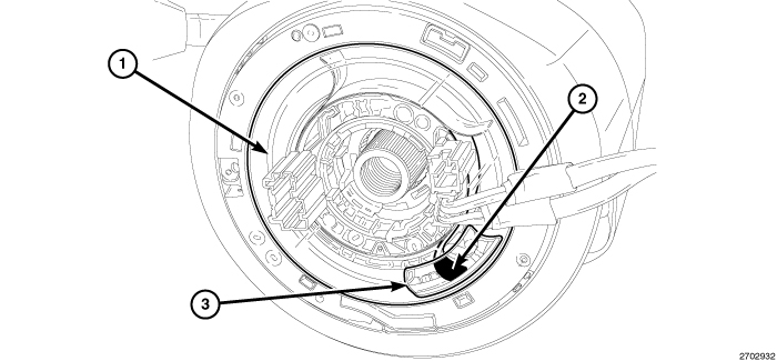 1. Before reinstalling a Steering Column Control Module (SCCM) onto a steering column, clockspring centering must be confirmed by viewing the inspection window (3) on the clockspring rotor (1). If the black squares (2) on the clockspring tape are not visible through the inspection window, clockspring centering has been compromised and the SCCM MUST be replaced with a new unit.