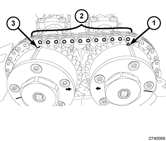 10. There should be 12 chain pins (2) between the exhaust cam phaser triangle marking (1) and the intake cam phaser circle marking (3).