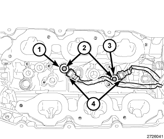NOTE: The forward sensor (1) is known to the powertrain control module (PCM) as knock sensor 1. The rear sensor (3) is known to the PCM as knock sensor 2.
