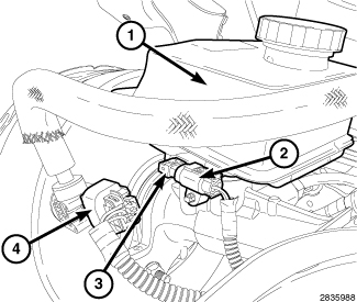 1. Disconnect the wire connector (2) from the brake fluid level sensor (3).