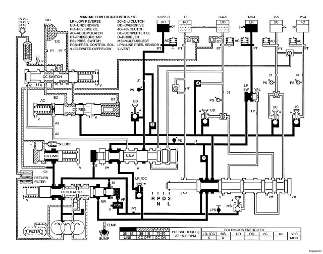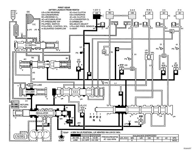 Figure 7 - HYDRAULIC FLOW IN FIRST GEAR (FROM K/D)