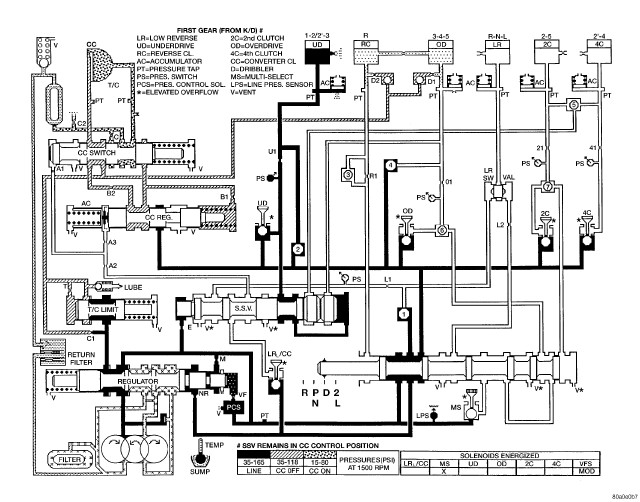 Figure 5 - HYDRAULIC FLOW IN FIRST GEAR (FROM N OR OD)