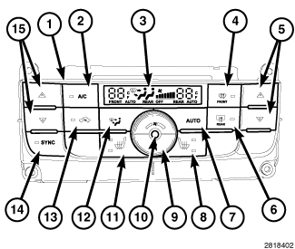 The A/C-heater control (1) for the Automatic Temperature Control (ATC) dual zone heating-A/C system allows both the driver and the front seat passenger the ability to individually regulate air temperature for their side of the vehicle. All controls are identified by International Standardization Organization (ISO) graphic symbols.