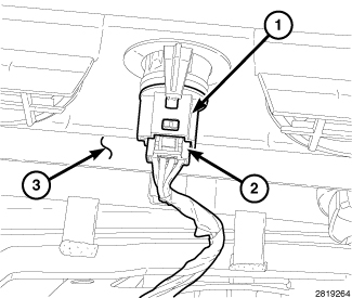 4. Disengage the two retaining tabs (1) that secure the sun sensor (3) to the back side of the defroster grille and remove the sensor.
