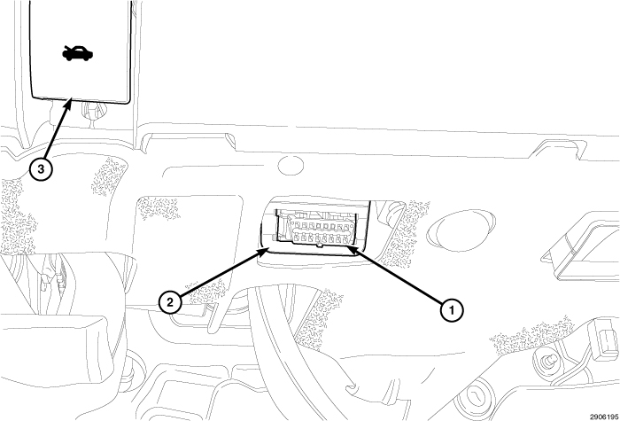 The Data Link Connector (DLC) (1) is a 16-way molded plastic connector insulator on a dedicated take out of the instrument panel wire harness. This connector is located at the lower edge of the instrument panel, outboard of the steering column. The connector insulator is retained by integral snap features within a rectangular cutout in a mounting bracket (2) located just under the lower edge of the IP, to the right of the hood release (3).