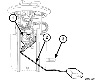 The main fuel level sending unit (fuel level sensor) (1) is located on the side of the main fuel pump module. The main fuel level sending unit and float arm (2) is serviced as an assembly. The auxiliary fuel pump module supply line is connected to the main fuel pump module supply port (3). The auxiliary fuel level sending unit is not serviceable. If replacement of the auxiliary fuel level sending unit is necessary, the auxiliary fuel pump module and fuel level sending unit must be replaced as an assembly.
