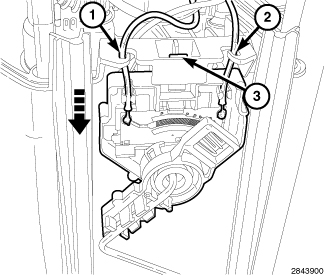 4. Release the fuel level sending unit plastic locking tab (3) and slide the sending unit down and out of the fuel pump module.