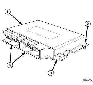 There are three mounting tabs (2 and 3) integral to the module housing that secure the module to the vehicle body. Two connector receptacles (4) containing terminal pins that connect the module to the vehicle electrical system are integral to the one side of the housing. One of the receptacles is utilized in vehicles equipped with only the rear park assist system, while both receptacles are used on vehicles equipped with both the front and rear park assist systems.