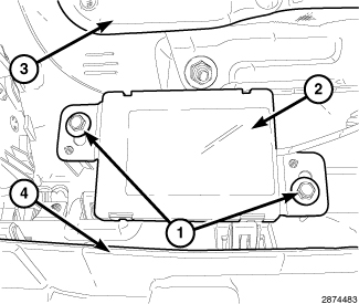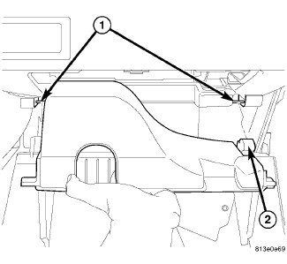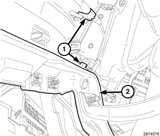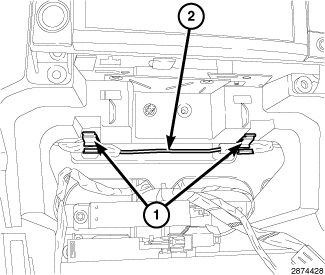 3. Through the glove box opening (2) install the two antenna harness clips (1) from the back of the instrument panel.