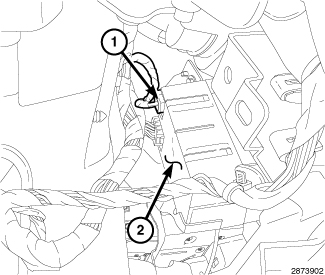 5. Through the steering column opening connect the Wireless Ignition Node (WIN) antenna connector (1) from the WIN (2).