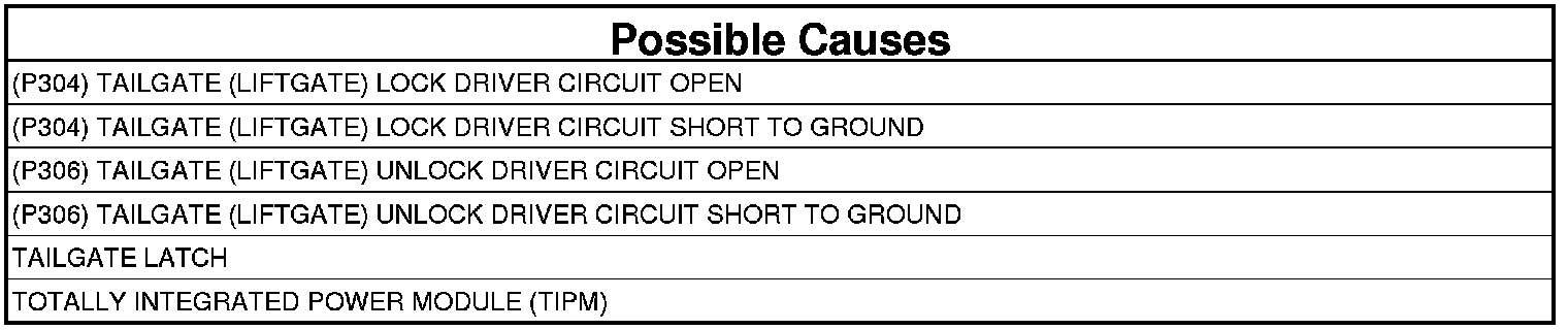 - Repair the (P304) Tailgate Lock Driver circuit for a short to ground.