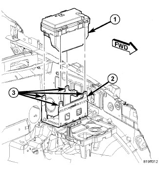 3. Position the TIPM (1) onto the mounting bracket (2) and push down until the four mounting clips are fully seated onto the mounting tabs (3).
