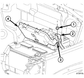 4. Open the TIPM cover (4) and position the TIPM positive cable (2) onto the mounting stud (3) and install the retaining nut (1). Tighten the nut to 20 - 28 Nm (180 - 250 in. lbs.).