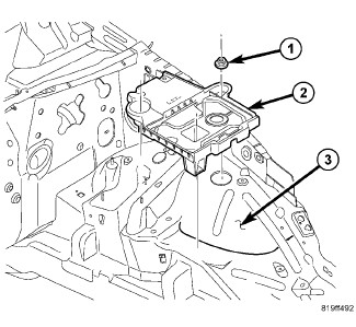 1. Position the battery tray (2) into the engine compartment and onto the mounting studs on the left inner fender (3).