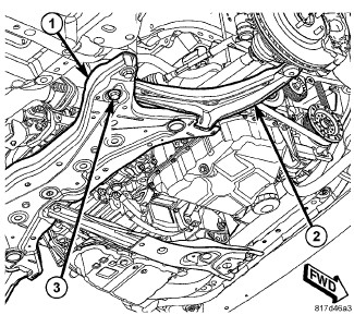 2. Insert the rear bolt (3) up through the crossmember (1) and lower control arm (2).