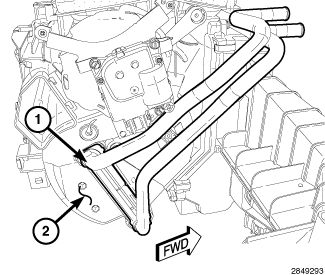 1. Carefully install the heater core (1) into the right side of the air distribution housing (2).
