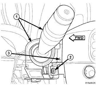 3. Install and tighten the screw (2) that secures the mounting tab on the front of the left multi-function switch to the mounting bracket on the clockspring. Tighten the screw to 1 Nm (10 in. lbs.).