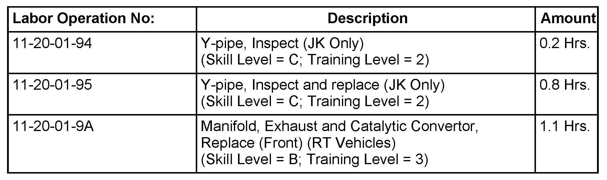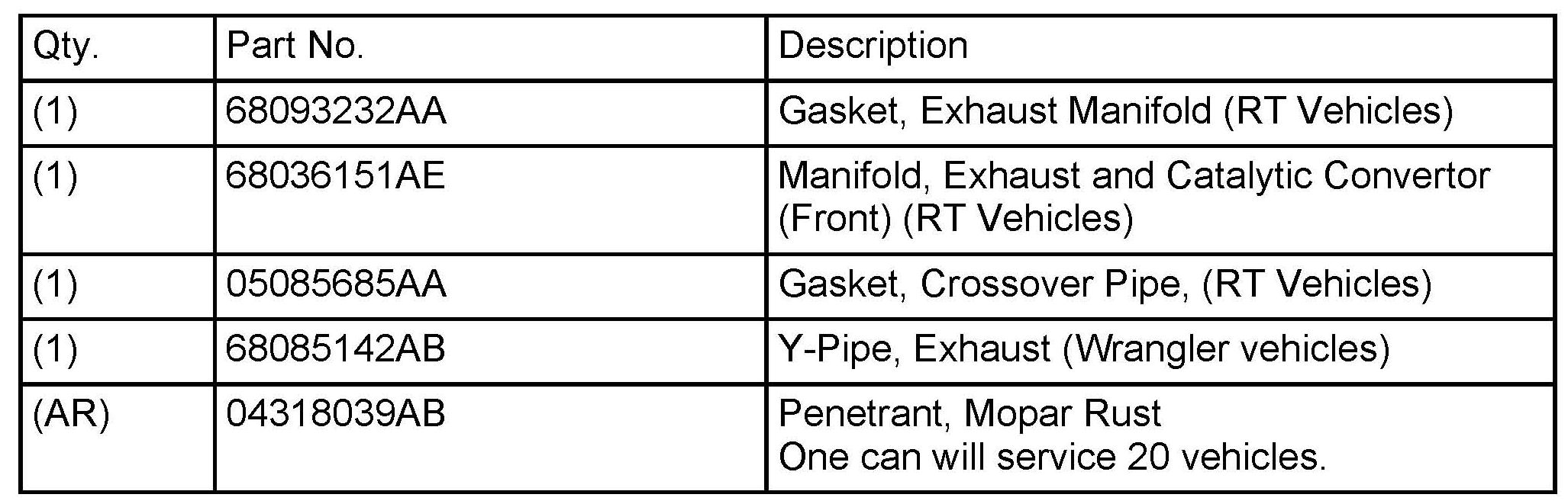 This bulletin involves inspecting the Julian Date on JK vehicles and only if necessary replacing the Y-Pipe. For RT vehicles it will be necessary to replace the front catalytic converter and gasket on all vehicles.