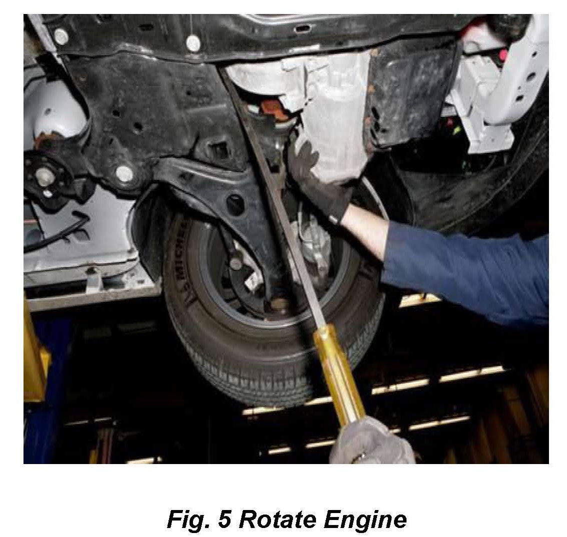 10. Using a long pry bar rock motor forward and block to support motor in the forward position (Fig. 5).