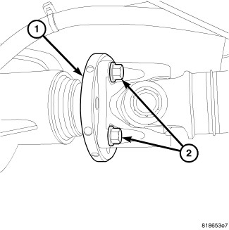 13. Install the front driveshaft onto the front differential flange (1). Tighten the bolts (2) to 110 Nm (81 ft. lbs.).