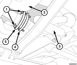 7. Align the Y-pipe flange (2) to the catalytic converter flange (5) and install the bolts (3). Tighten the bolts to 23 Nm (17 ft. lbs.).