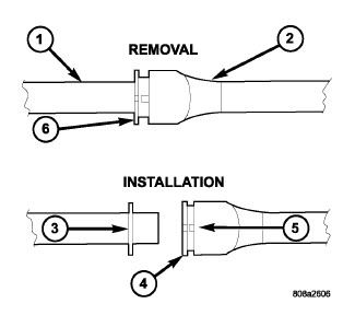 1. Firmly push the quick-connect fitting (5) towards the component being serviced while firmly pushing the round plastic retainer ring into the quick-connect fitting (6). With the round plastic ring depressed, remove the quick-connect fitting from the fuel system component.