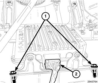 1. Install the power inverter module, install the lower power inverter retainers (1) and connect the wiring connector (2).