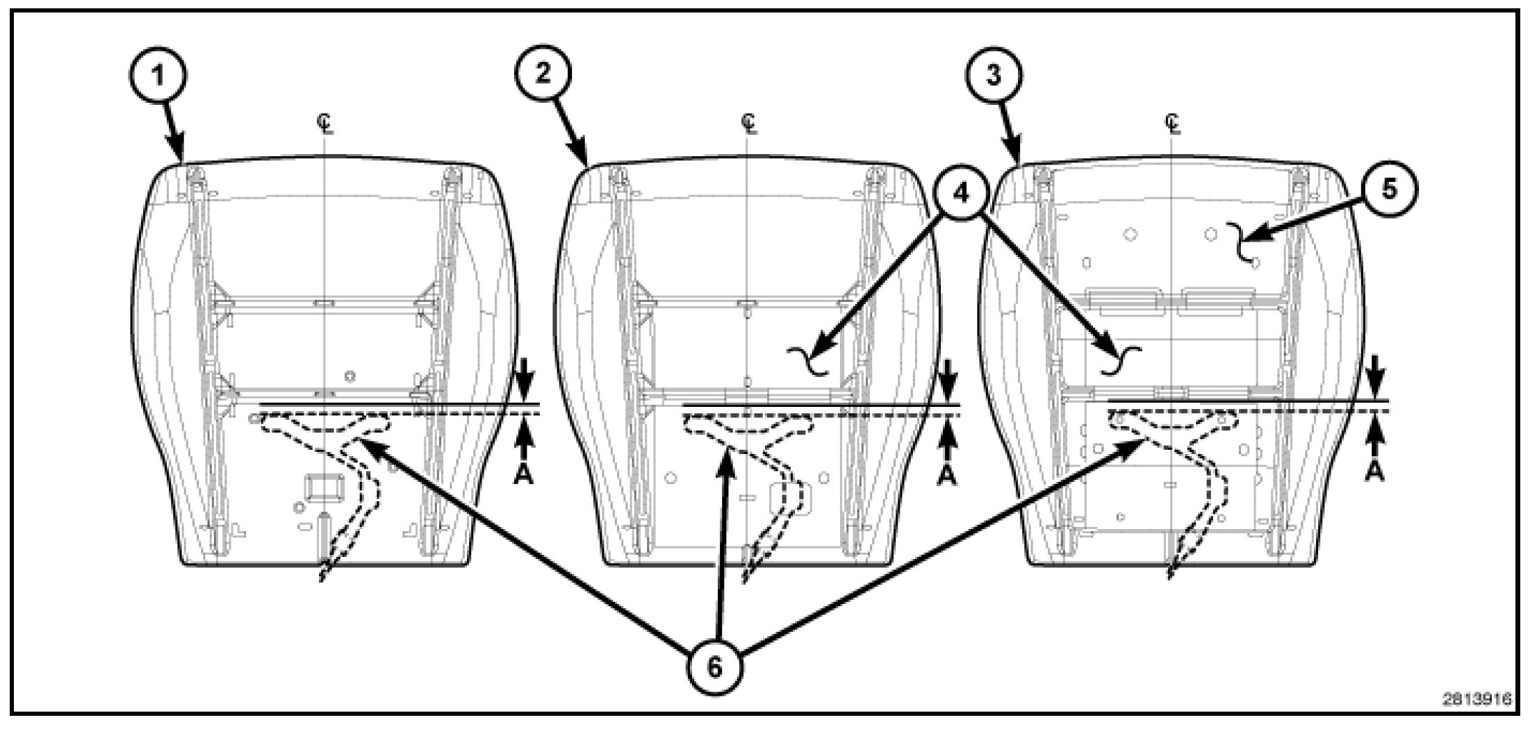 1. Mark the Center Line (CL) of the seat cushion on the top of the seat cushion foam (1) or, if the vehicle is so equipped, on the seat cushion heater element mat (4) of a heated seat (2) or heated and ventilated seat (3).