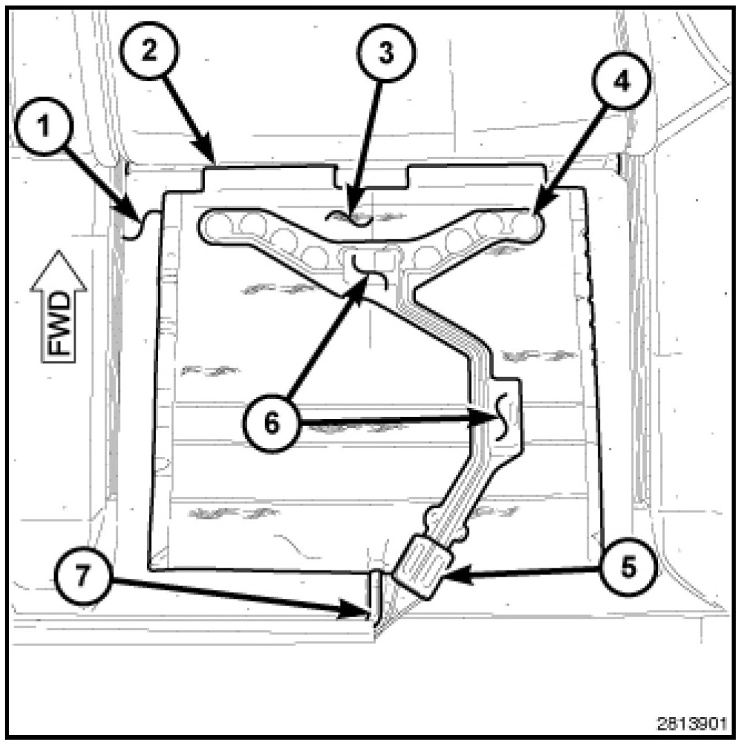 6. Route the ODS pigtail wires that exit the back of the hot melt block (5) through the recess (7) at the back of the seat cushion foam.