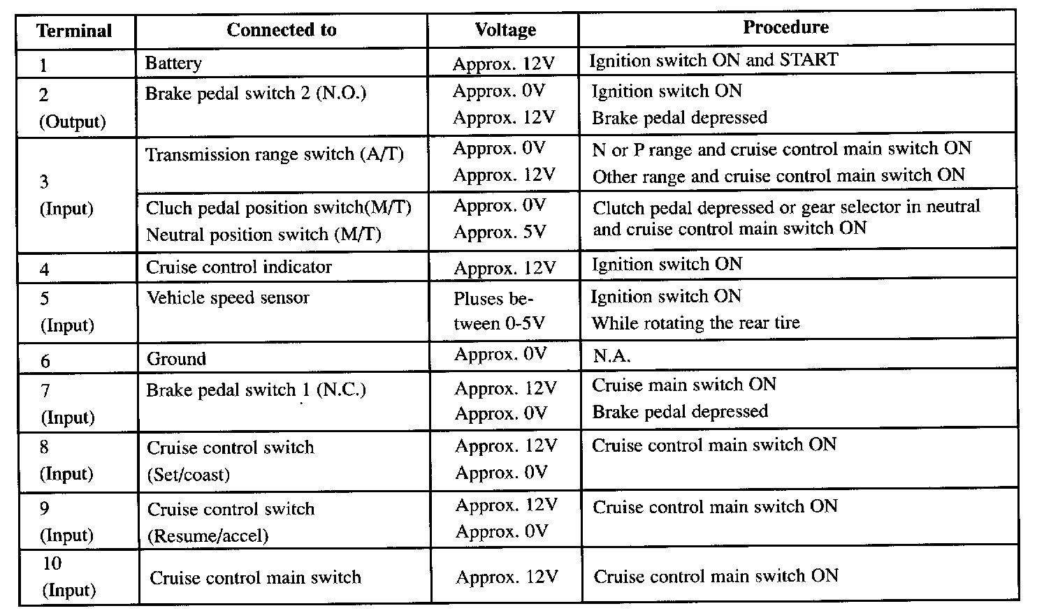 Connect a voltmeter between cruise control unit terminals and ground. (Connector C214 connected.)