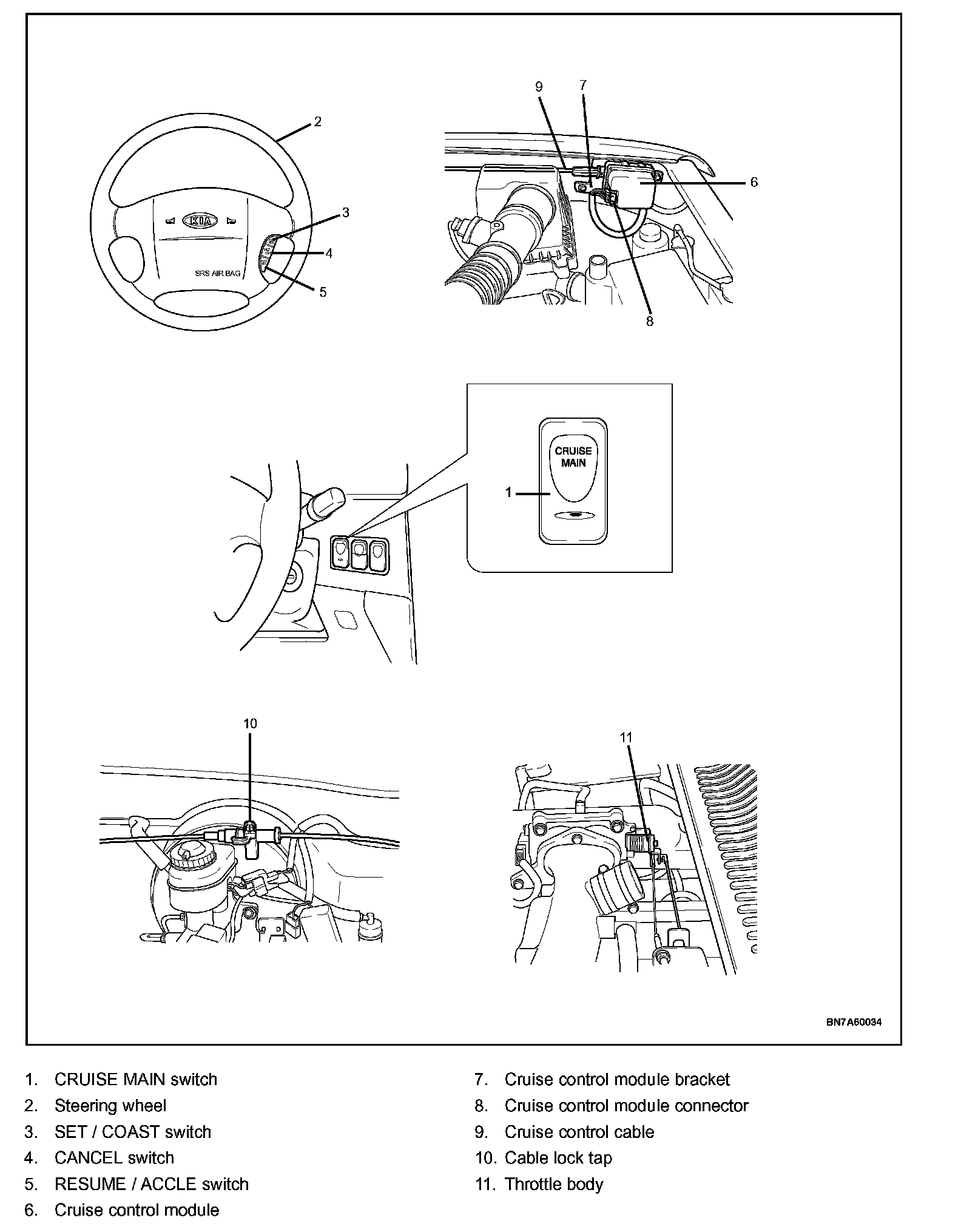 The main components of SMCC system are mode control switches, clutch switch, brake switch, vehicle speed sensor, cruise control module and control cable that connect throttle body.