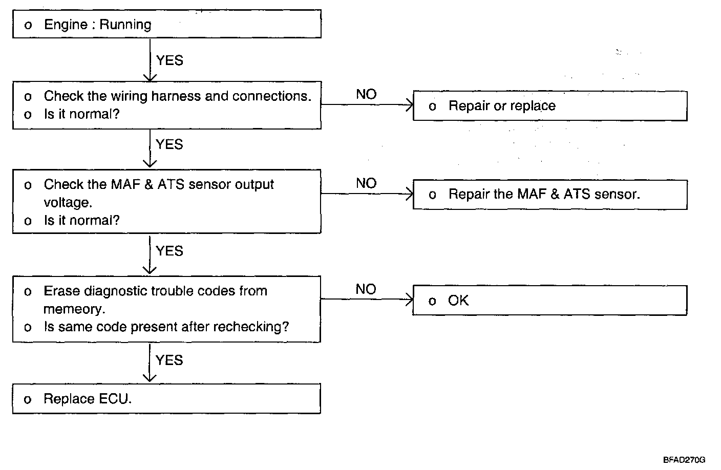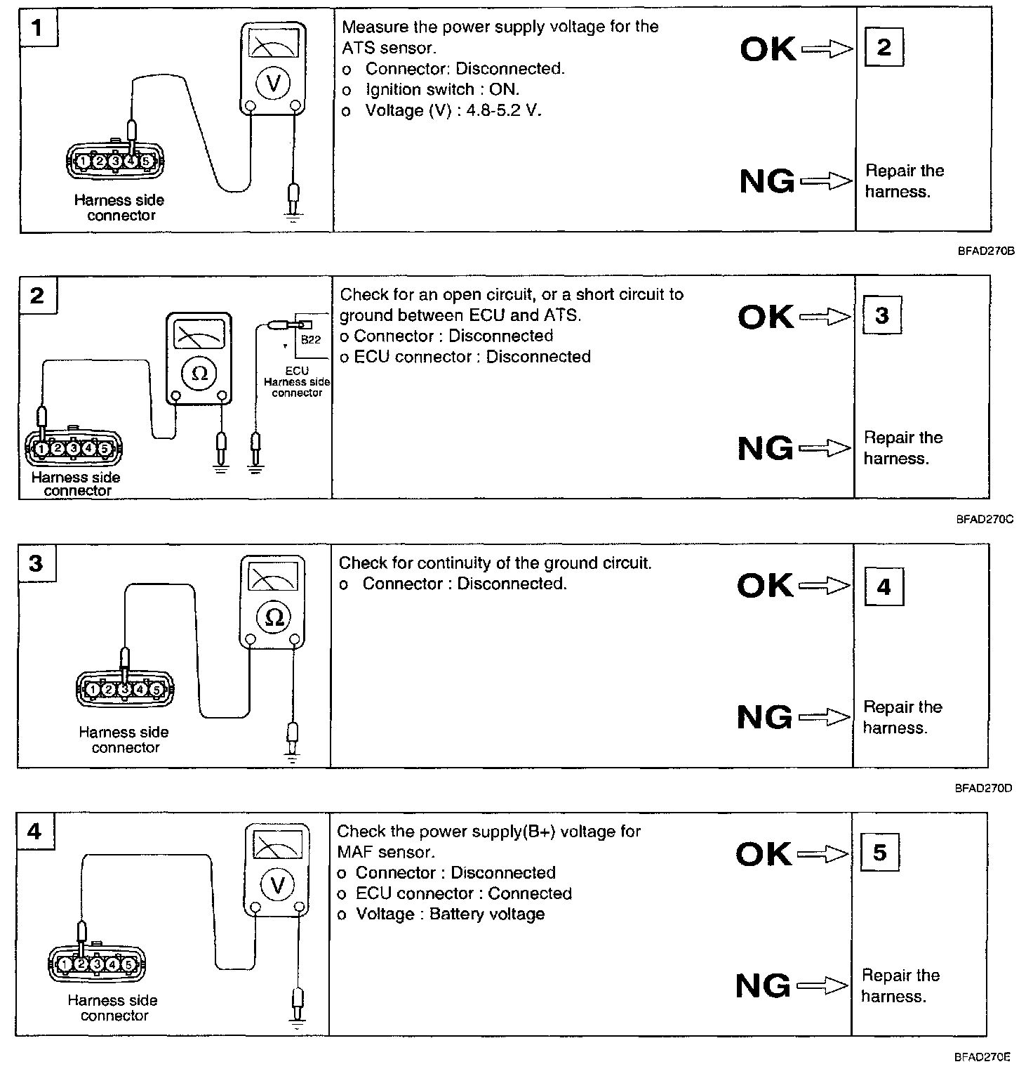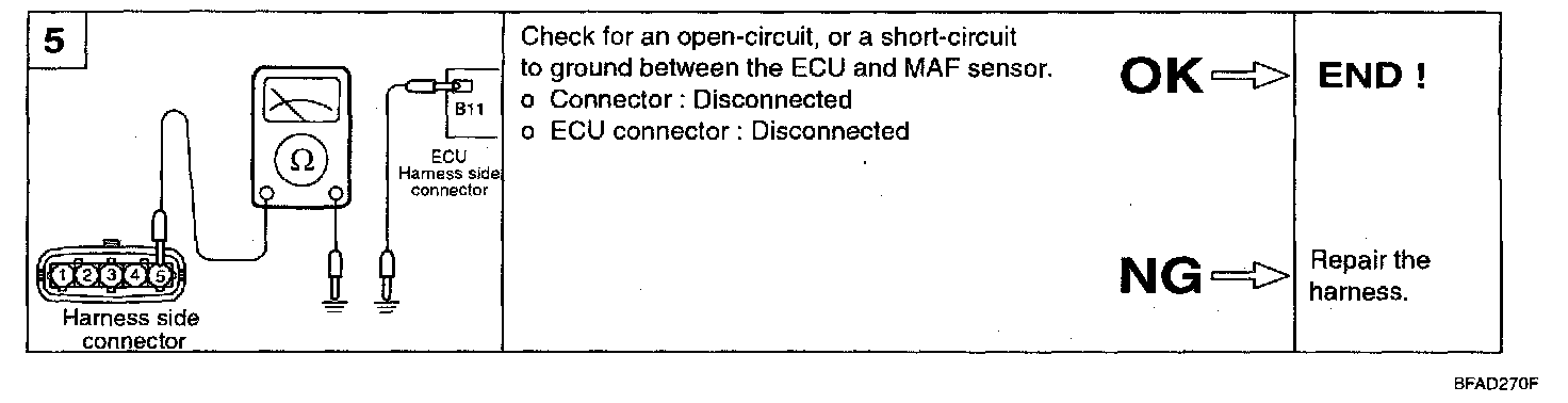 2. If the MAF sensor output voltage is other than 0 when the ignition switch is turned on (do not start the engine), check for a faulty MAF sensor or ECU.