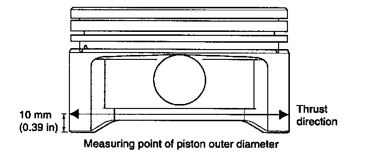 6. To rebore the cylinder to oversize, keep the specified clearance between the oversize piston and the bore, and make sure that all pistons used are of the same oversize. When measuring the piston outside diameter measure the section of the thrust surface at 10 mm (0.39 inch) above the bottom of the piston skirt.