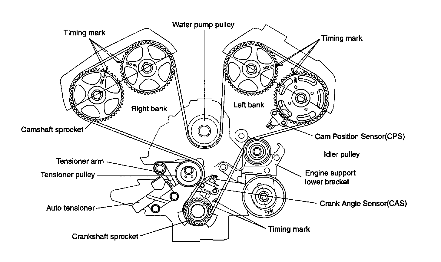 Crankshaft sprocket -> Idler pulley -> Left bank exhaust camshaft sprocket -> Left bank intake camshaft sprocket -> Water pump pulley -> Right bank intake camshaft sprocket -> Right bank exhaust camshaft sprocket -> Tensioner pulley.