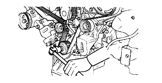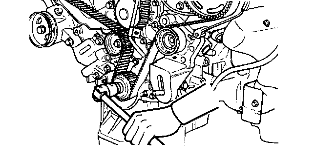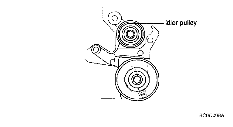 2. If any abnormal noise or difficulty in rotating the pulley by hand is noticed, replace the timing belt tensioner and idler pulley.