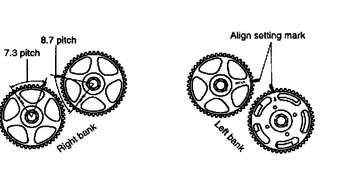 - In case the right bank camshaft sprocket rotates excessively, be cautious not to rotate more than the initial stable position. Always align timing mark of rotating sprocket by turning it reversely. In this case, pay attention not to rotate it reversely from the initial position. (if, with one sprocket fixed at No. 1 compression TDC position, the other sprocket is rotated one revolution clockwise or counter clockwise, then the intake and exhaust valve might interfere each other.)