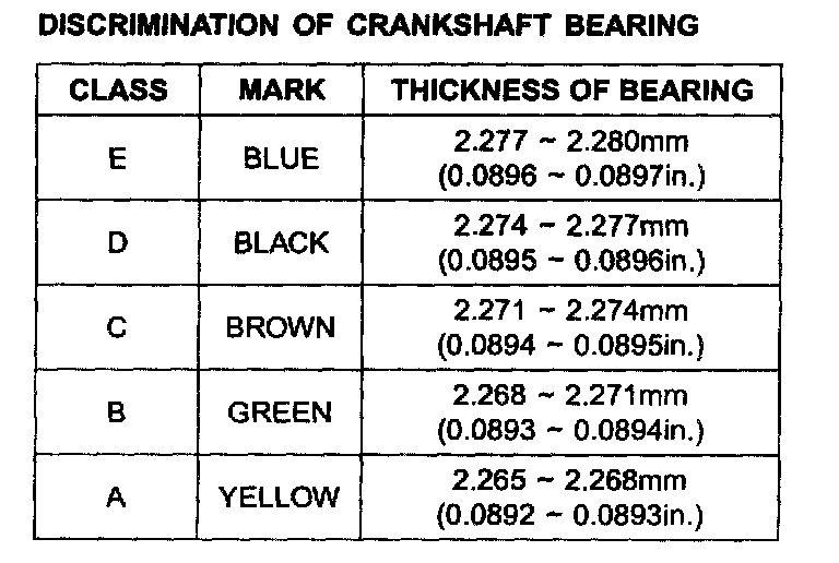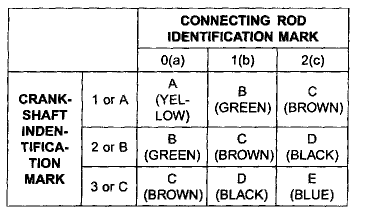 6) If the plastigage measures too wide or too narrow, remove the upper half of the bearing, install a new, complete bearing with the same color mark (select the color as shown in the next column), and recheck the clearance.