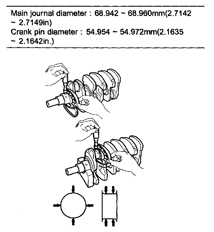 Using a micrometer, measure the diameter of each main journal and crank pin.