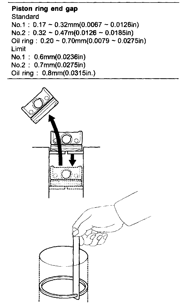 To measure the piston ring end gap, insert a piston ring into the cylinder bore. Position the ring at right angles to the cylinder wall by gently pressing it down with a piston. Measure the gap with a feeler gauge. If the gap exceeds the service limit, replace the piston ring. If the gap is too large, recheck the cylinder bore diameter against the wear limits. If the bore is over the service limit, the cylinder block must be replaced.