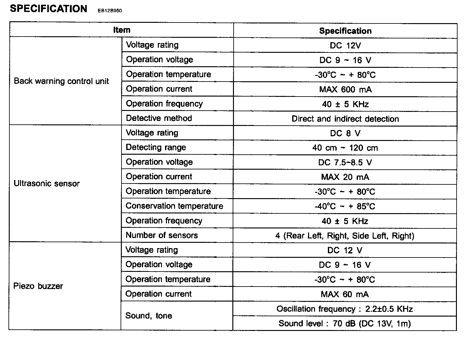 Specification - Back Warning System: