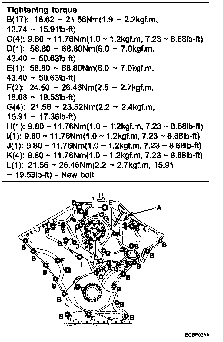 Crankshaft pulley bolt (1) 284.2 - 303.8 Nm (29.0 - 31.0 kgf.m, 209.76 - 224.22 lb.ft)
