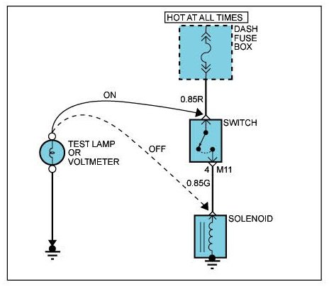 A. Connect one lead of a test lamp or voltmeter to a ground. If you are using a voltmeter, be sure it is the voltmeter's negative test lead you have connected to ground.