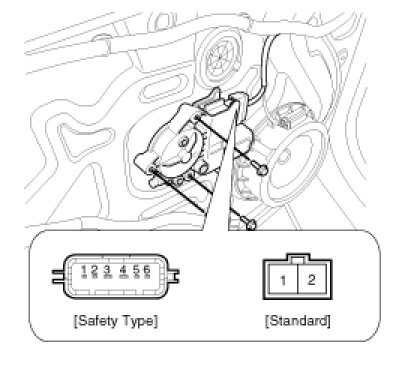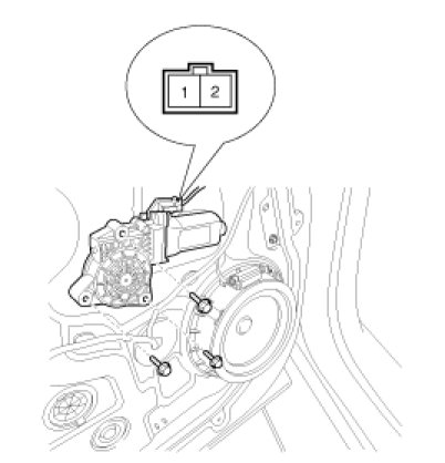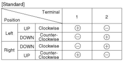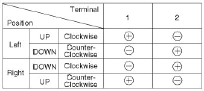 4. Connect the motor terminals directly to battery voltage (12V) and check that the motor operates smoothly. Next, reverse the polarity and check that the motor operates smoothly in the reverse direction. If the operation is abnormal, replace the motor.