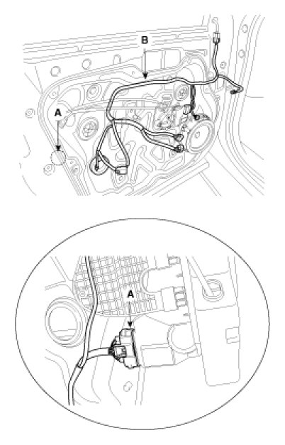 5. Disconnect the door module wiring harness (B), remove the module assembly.