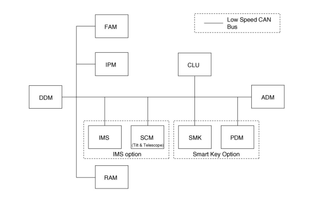 1. The body network system consists of several Modules that communicates via a CAN bus. The diagnostic tester is not directly connected to the CAN bus, but utilizes a one-wire communication line (K-line) that connects to a gateway in the IPM ECU.