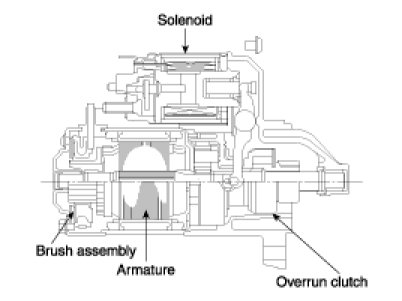 The contacts close and the starter motor cranks. In order to prevent damage caused by excessive rotation of the starter armature when the engine starts, the clutch pinion gear overruns.