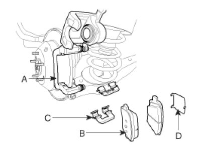 2. Replace pad shim (D), pad retainers (C) and brake pads (B) in the caliper bracket (A).