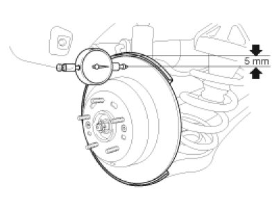 1. Place a dial gauge about 5mm (0.2 in.) from the outer circumference of the brake disc, and measure the runout of the disc.
