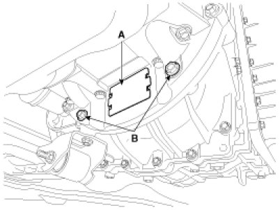 1. Remove the dust cover (A) on the bottom of the ladder frame and unfasten the two transaxle mounting bolts (B).